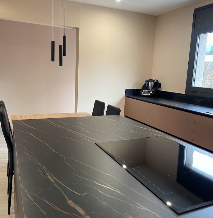 La encimera de cocina en porcelánico de la firma Laminam en acabado Noir Desir mate, ofrece una combinación perfecta de elegancia y durabilidad.